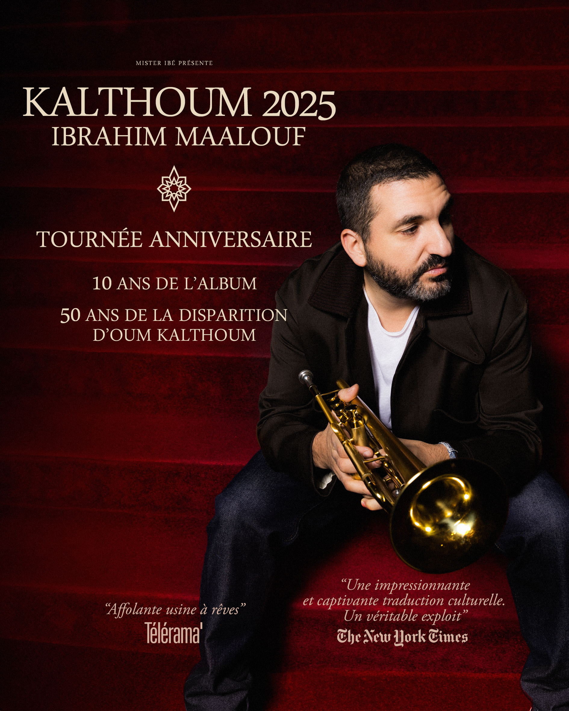 En novembre et décembre 2025, Ibrahim Maalouf portera cet hommage sur scène lors d’une tournée exceptionnelle. Cette célébration des 10 ans de l’album et des 50 ans de la disparition de l’Astre de l’Orient investira des lieux prestigieux (parmi lesquels le Victoria Hall à Genève, la Philharmonie du Luxembourg, le Théâtre Femina à Bordeaux…).
